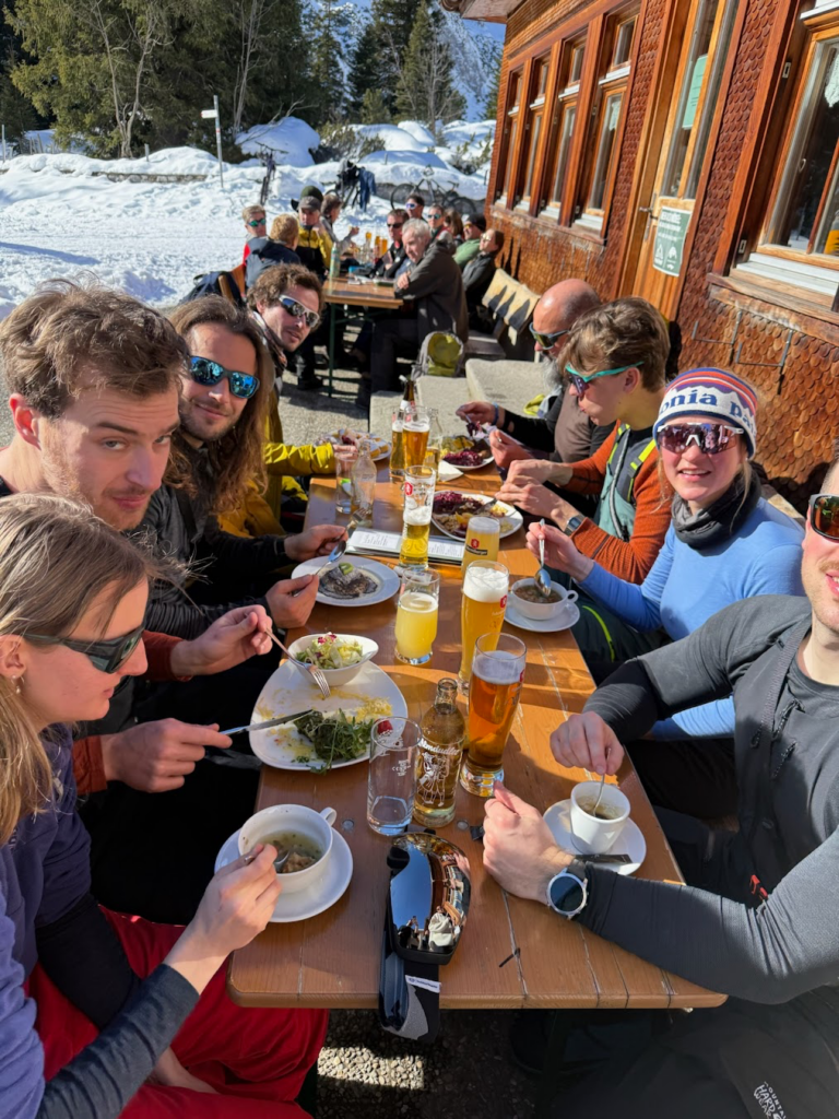 Im Aufstieg werden routiniert Gruppencheck, Materialcheck und Markierfunktion abgespult, so dass schon bald die Lindauer aus dem Wolkenmeer empor wächst. Nach einer kleinen Stärkung im duften Schuhraum der Hütte, geht es weiter auf die Spora Alpe. Hier werden vergrabene Schätze mit LVS und Sonde gesucht und Haltungsnoten für die akrobatischsten Spitzkehren vergeben, bevor wir den Abend in der Hütte ausklingen lassen.
