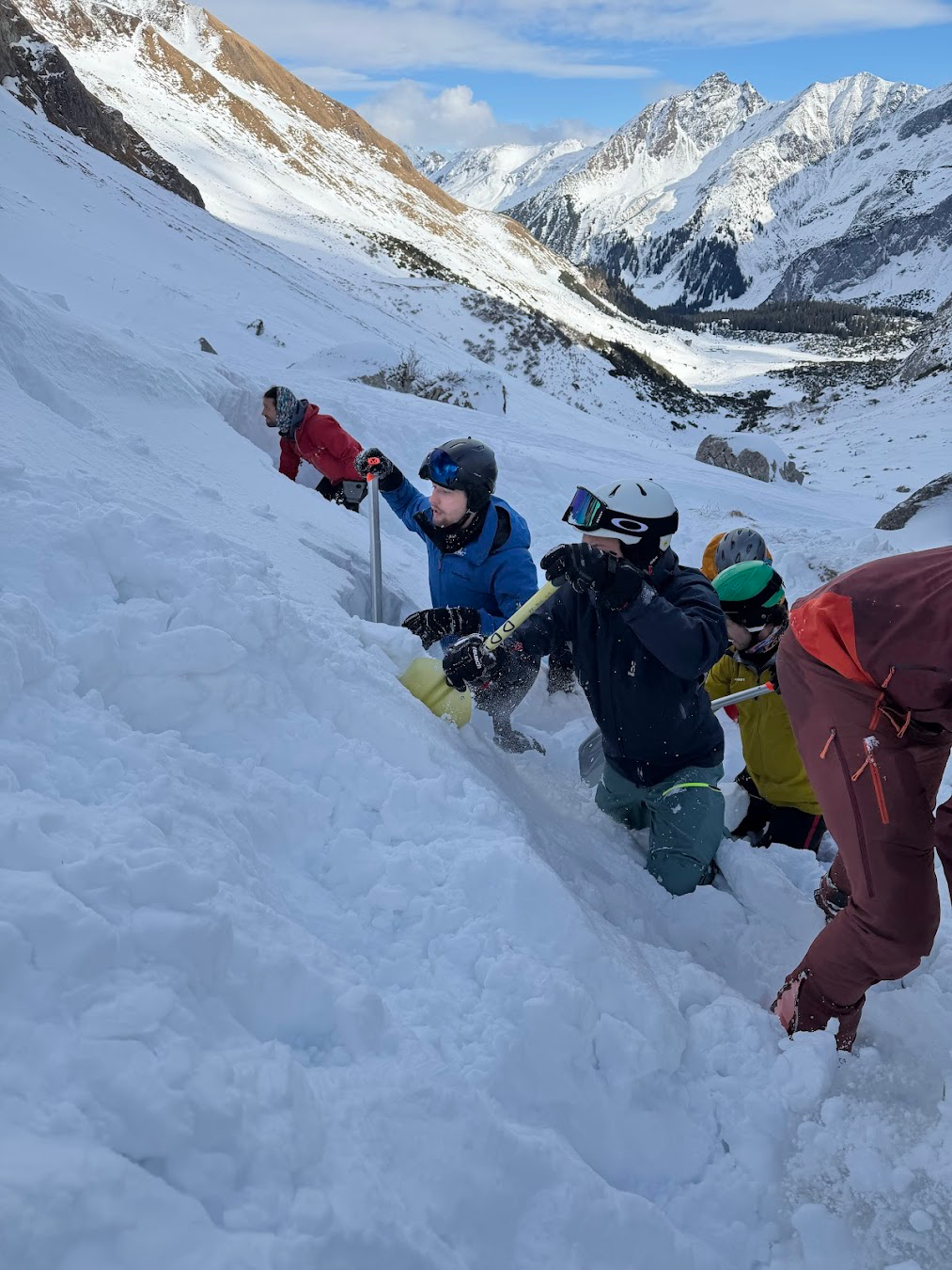 Es wird sofort geankert, LVS-Geräte beepen nervös und mit Sonden und Schaufel wird dem Gerücht tief, sehr sehr tief mittels Schneeförderband auf den Grund gegangen.